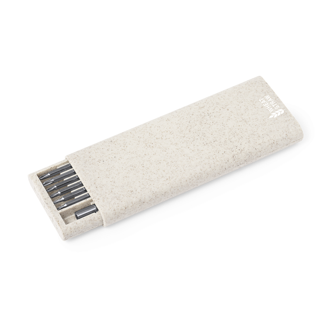 Praktisches Werkzeugset aus Weizenstroh, innen gestanzt für eine perfekte Passform. Enthält einen Präzisionsschraubendreher mit 24 Zubehörteilen, bestehend aus verschiedenen Bits: Kreuzschlitz-, Inbus- und Flachbits. Inklusive Weizenstroh-Logo. Einzeln verpackt in einer Kraftbox.Weizenstroh fördert die Verwendung von natürlichen Rohstoffen und reduziert so den Schadstoffausstoß.