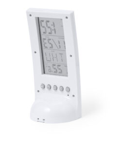 Wetterstation aus widerstandsfähigem ABS, mit Temperatursensor. Zeitfunktion (12/24), Kalender, Alarm und Wochentag. Mit Sockel/Halterung und hinteren Bedientasten. Batteriebetrieben (2xAAA nicht im Lieferumfang enthalten) und präsentiert in einer attraktiven Kraft-Design-Box. Gebrauchsanweisung in Englisch und Spanisch.