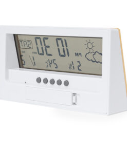 Wetterstation mit Bambusfront. Mit Temperatur- und Feuchtigkeitssensor. Kalender und Alarmfunktion. Batteriebetrieben (1xAAA nicht im Lieferumfang enthalten) und präsentiert in einer attraktiven Kraft-Design-Box. Gebrauchsanweisung in Englisch und Spanisch erhältlich.Materialien wie Bambus fördern die Verwendung von natürlichen Rohstoffen und verringern die Schadstoffemissionen. Es handelt sich um eine sehr widerstandsfähige und vielseitige Pflanze, die schnell wächst und sich regeneriert, was sie zu einer hervorragenden Alternative zu herkömmlichem Holz macht.