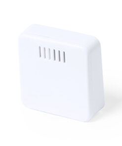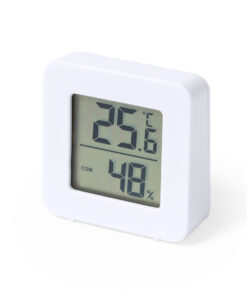 Wetterstation aus robustem ABS mit weißer Oberfläche. Gut ablesbares LCD-Display mit Thermometer und Feuchtigkeitssensor. Magnetische Befestigung und batteriebetrieben (Knopfzelle im Lieferumfang enthalten, mit Schutzfolie). Präsentiert in einer individuellen Kraftpapier-Designbox, mit Bedienungsanleitung in Englisch und Spanisch.