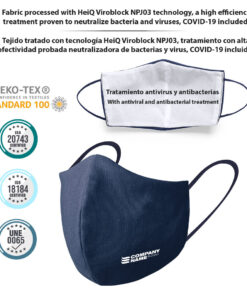 Wiederverwendbare hygienische Maske. Hergestellt aus Baumwolle und Polyester. Materialien mit HeiQ Viroblock NPJ03-Technologie, einer Behandlung mit nachgewiesener hoher Wirksamkeit bei der Neutralisierung von Bakterien und Keimen. Mit ergonomischer Vordernaht für einen bequemen Sitz und komfortablen, elastischen Ohrbändern aus hypoallergenem Material, mit OEKO-TEX Klasse I Zertifizierung. Einzeln verpackt. Graphen Frei. Für den persönlichen Gebrauch von Erwachsenen. Getestet und hergestellt nach der europäischen Norm UNE-CWA 17553:2020. Behandlungseigenschaften analysiert nach ISO 20743: Bestimmung der antibakteriellen Aktivität von Textilprodukten und ISO 18184: Bestimmung der antiviralen Aktivität von Textilerzeugnissen. HeiQ Viroblock NPJ03 Zusatzstoff zertifiziert als sicher und nachhaltig, mit allen Komponenten in Kosmetikqualität, biobasiert und recycelt. Bakterielle Filtrationseffizienz: ≥ 90%. Hochbeständig. Waschen bei 60°C wird empfohlen.