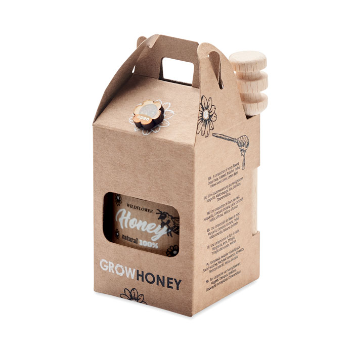 Wildblumenhonig im Glas (50 g) inkl. Honiglöffel aus Holz und Honigblumen-Samen. Verpackt in einer Schachtel aus Kraftpapier. Hergestellt in der EU.