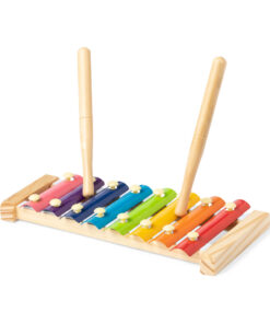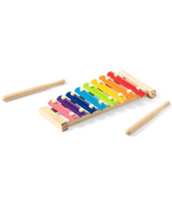 Xylophon mit Sockel und Trommelstöcken aus natürlichem Kiefernholz. Mehrfarbige Metallschlüssel, präsentiert in einer individuellen Box mit Kraftpapier-Design.