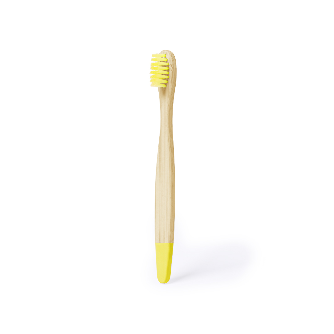 Zahnbürste aus Bambus. Für Kinder konzipiert, mit bunten Borsten und Spitzen. Einzeln in einer Kraftbox präsentiert.