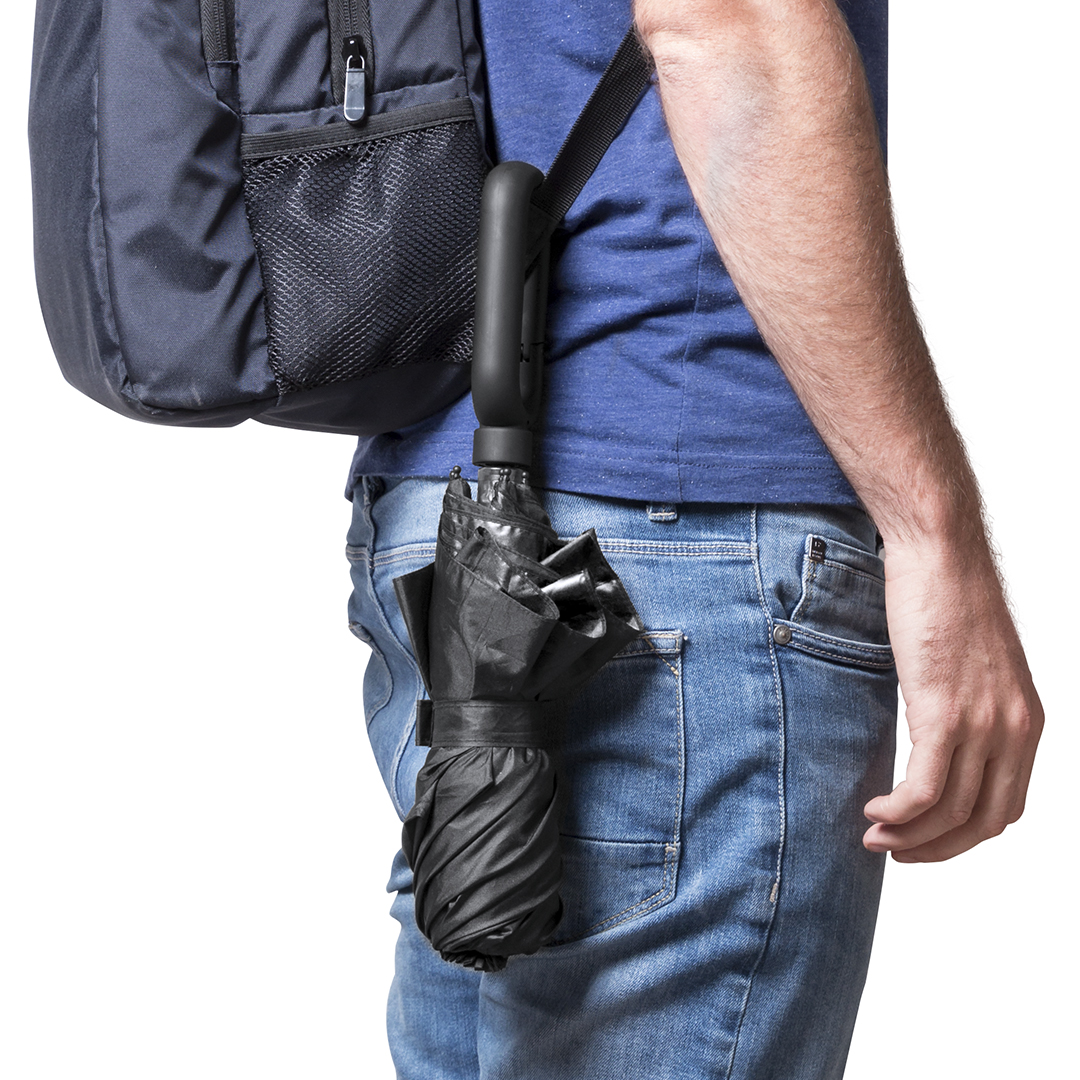 Winddichter Taschenschirm mit 8 Panelen aus robustem Pongee-Material in einer Vielzahl von Farben. Mit einem Durchmesser von 100 cm, manueller Öffnung und Fiberglasgestänge in Schwarz sowie Klettverschluss und ergonomischem Griff mit integriertem Karabiner. Präsentiert in einer individuellen Hülle in passender Farbe.