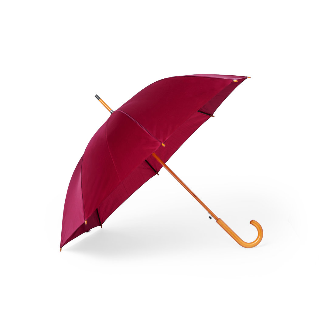 8-Panel-Regenschirm mit 105 cm Durchmesser, hergestellt aus strapazierfähigem 190T-Polyestermaterial. Automatische Öffnung, mit gebogenem Griff und Schaft, beide aus Holz. Schwarze Metallrippen, Klettverschluss und in vielen Farben erhältlich.