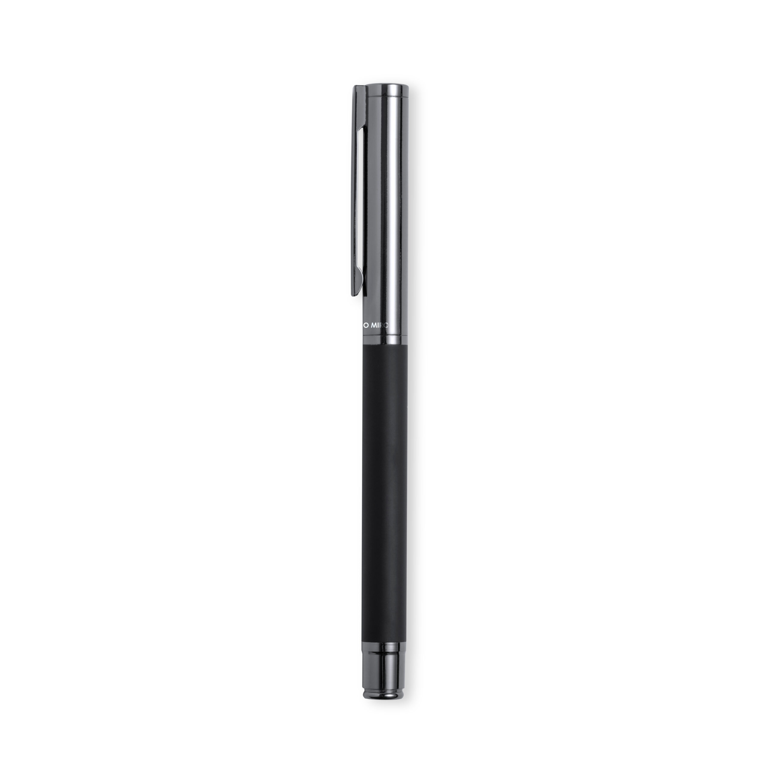 Rollerpen von Antonio Miró aus Metall, mit mattschwarzem Schaft. Verchromte Details und Kappe mit Markenlogo. Jumbo-Patrone und blauschreibender Tinte. Präsentiert in einer eleganten und widerstandsfähigen schwarzen Einzelschachtel mit Antonio Miró-Logo und passendem Etui.