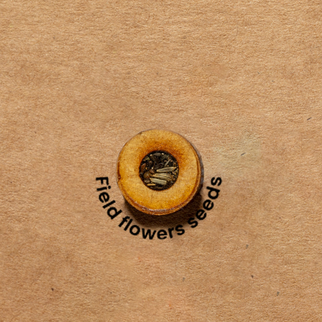 Samenmappe aus recyceltem Karton. Flexibler Einband mit spezieller Innenhalterung für Papierblätter und Gummibandverschluss. Die Hülle enthält eine Kapsel mit Wildsamen.