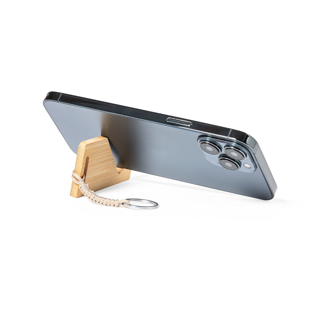 Schlüsselanhänger der Linie Natur aus Bambus, mit integriertem Smartphone-Halter und origineller Schnur. Präsentiert in individueller Tasche mit Öko-Karton innen.