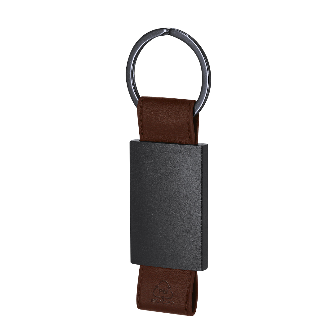 Spaßiger Design-Schlüsselanhänger mit recyceltem PU-Tape. Mit schwarzem Korpus in matter Lackierung.