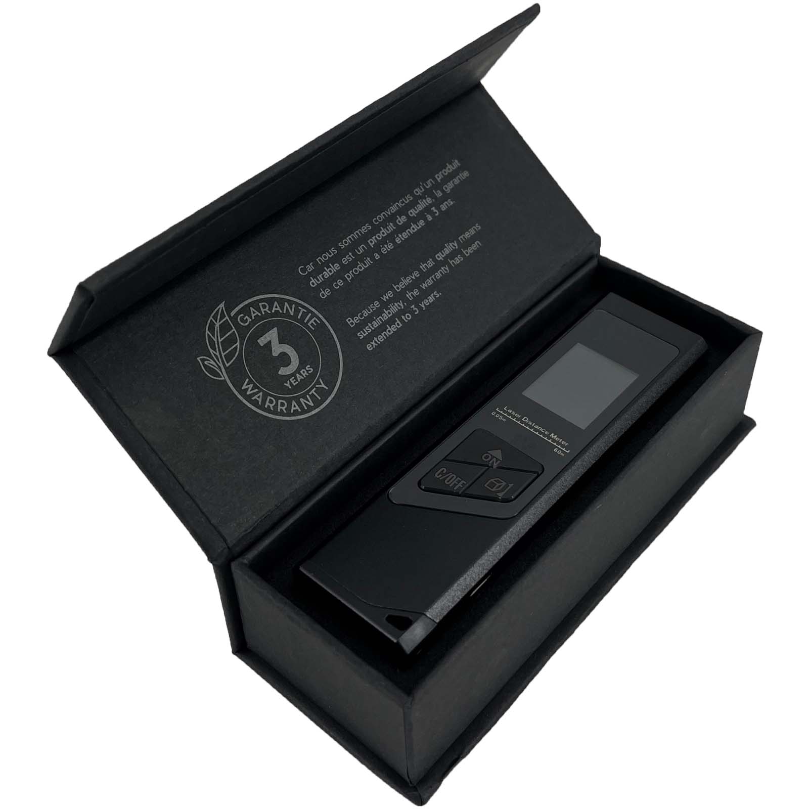 Der Mini-Laserentfernungsmesser bietet eine einfachere, schnellere und genauere Möglichkeit zur Messung von Flächen und Volumina und verfügt außerdem über eine Pythagoras-Funktion. Mit seiner Laser-Präzisionstechnologie und dem Echtzeit-Messmodus liefert er zuverlässige Messungen bis zu 40 Metern. Der Entfernungsmesser verwendet einen energiesparenden 200 mAh Li-Ionen-Akku als Stromversorgung und kann nach einer vollen Aufladung 2000 Entfernungen messen. Das Display ist hintergrundbeleuchtet, sodass Sie es auch in dunklen Umgebungen leicht ablesen können. Größe 9 × 2,4 × 1,1 cm. Verpackt in einer Geschenkbox aus recyceltem Papier (10,2 × 4,2 × 3 cm) mit Magnetverschluss. Inklusive 3 Jahre Garantie.