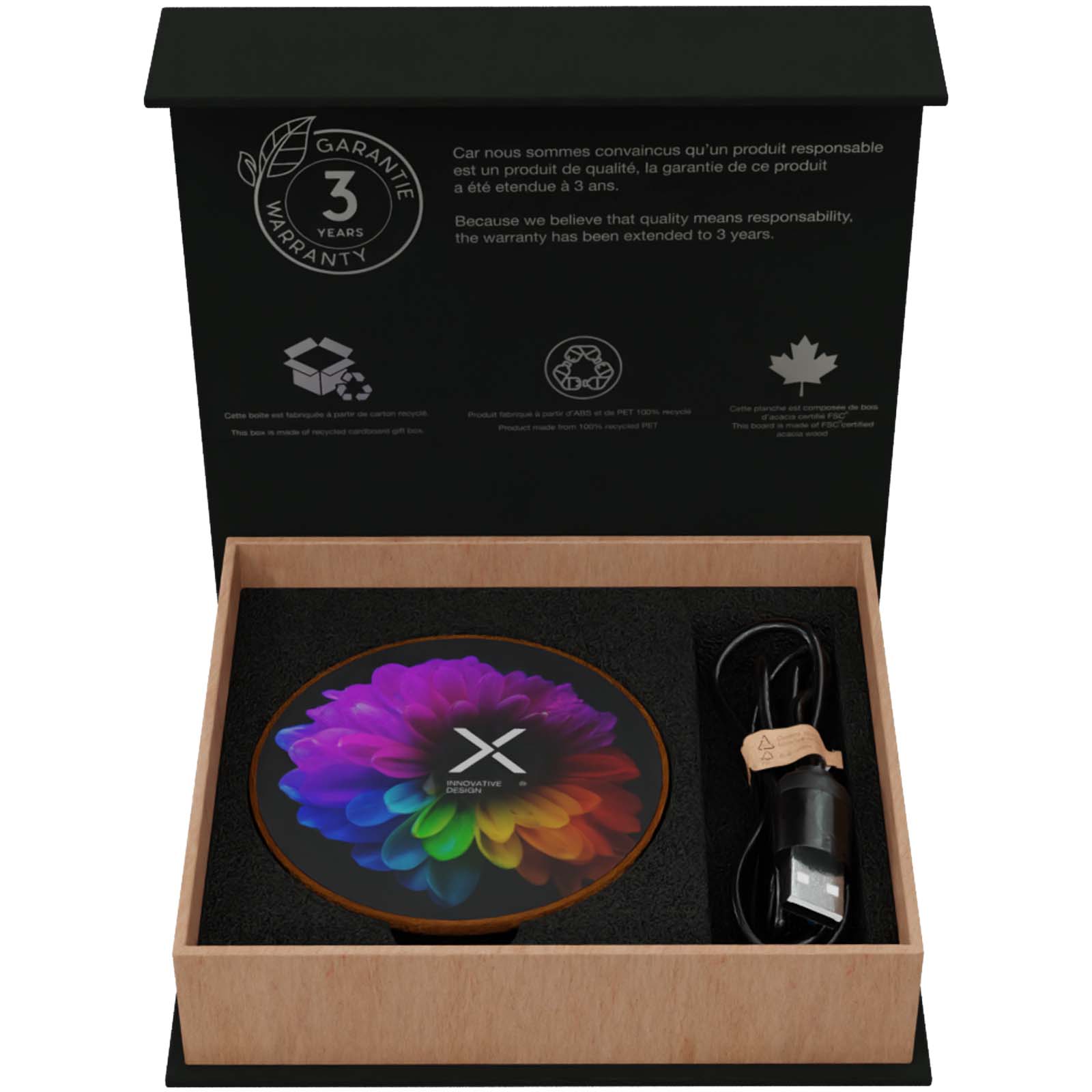 Kabellose 10 W Ladestation mit leuchtendem Logo, antibakterieller Soft-Touch-Oberfläche und aus Holz. Mit einem Ladekabel aus recyceltem PET-Kunststoff. Geliefert in einer schwarzen Kraft-Geschenkbox aus Recyclingpapier mit magnetischem Schließmechanismus. Patent EUROPE EUIPO.