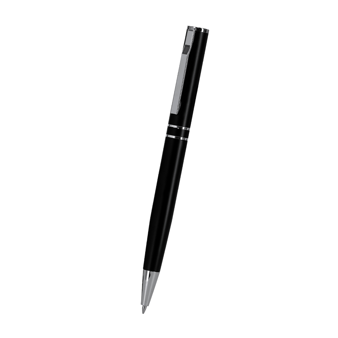 Ein Set aus Stift und Rolle aus recyceltem Aluminium im eleganten mattschwarzen Design mit markanten Accessoires in Silberlackierung. Druckknopfmechanismus, Stift und Rolle mit Motorhaube, beide mit Metallklammer. Mit blauer Tinte und Logo aus recyceltem Aluminium. Präsentation in einem eleganten schwarzen Gehäuse.
