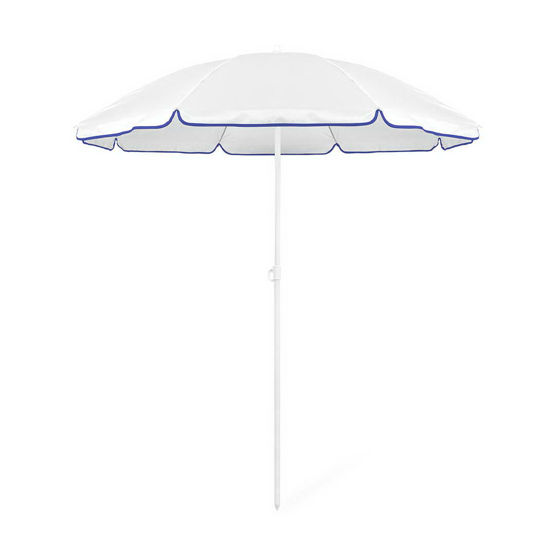 Sonnenschirm mit 8 Panelen aus robustem Nylon in verschiedenen lebendigen Farben. Mit einem Durchmesser von 150 cm, Paspelierung an den Rändern und höhenverstellbaren Metallrohren in Weiß. Präsentiert in einer PVC-Hülle mit Schultergurt.