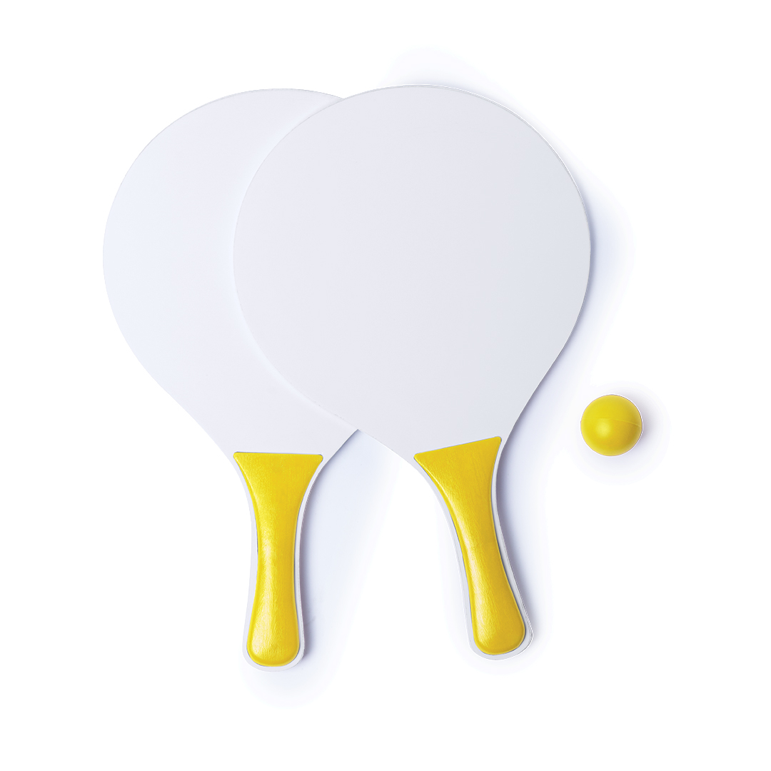 Beachball-Set mit zwei Schlägern aus Naturholz in Weiß. Mit verstärktem Griff in verschiedenen lebendigen Farben. Präsentiert in einer Netztasche mit Ball in passender Farbe.