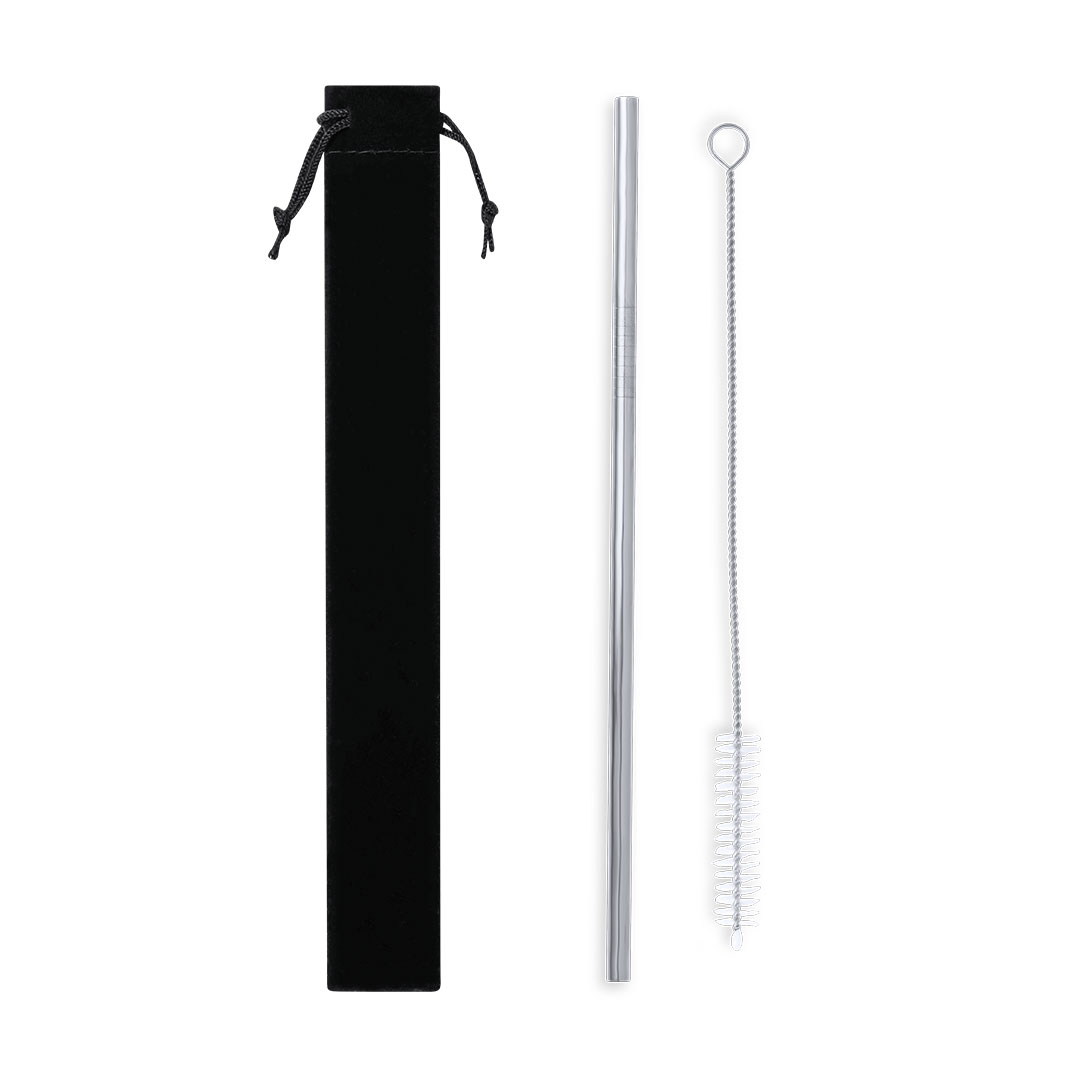 Wiederverwendbarer Strohhalm in Edelstahl. Mit Reinigungsbürstenzubehör enthalten und in einem weichen Mikrofasergehäuse mit verstellbaren Kabeln für besseren Verschluss präsentiert.