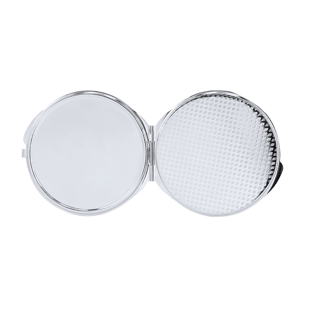 Faltbarer metallischer Spiegel mit Sublimationsfläche (nicht im Produkt integriert, ideal zum Drucken und späteren Aufkleben). Mit zwei Innenspiegeln: 1X und 2X-Vergrößerung.