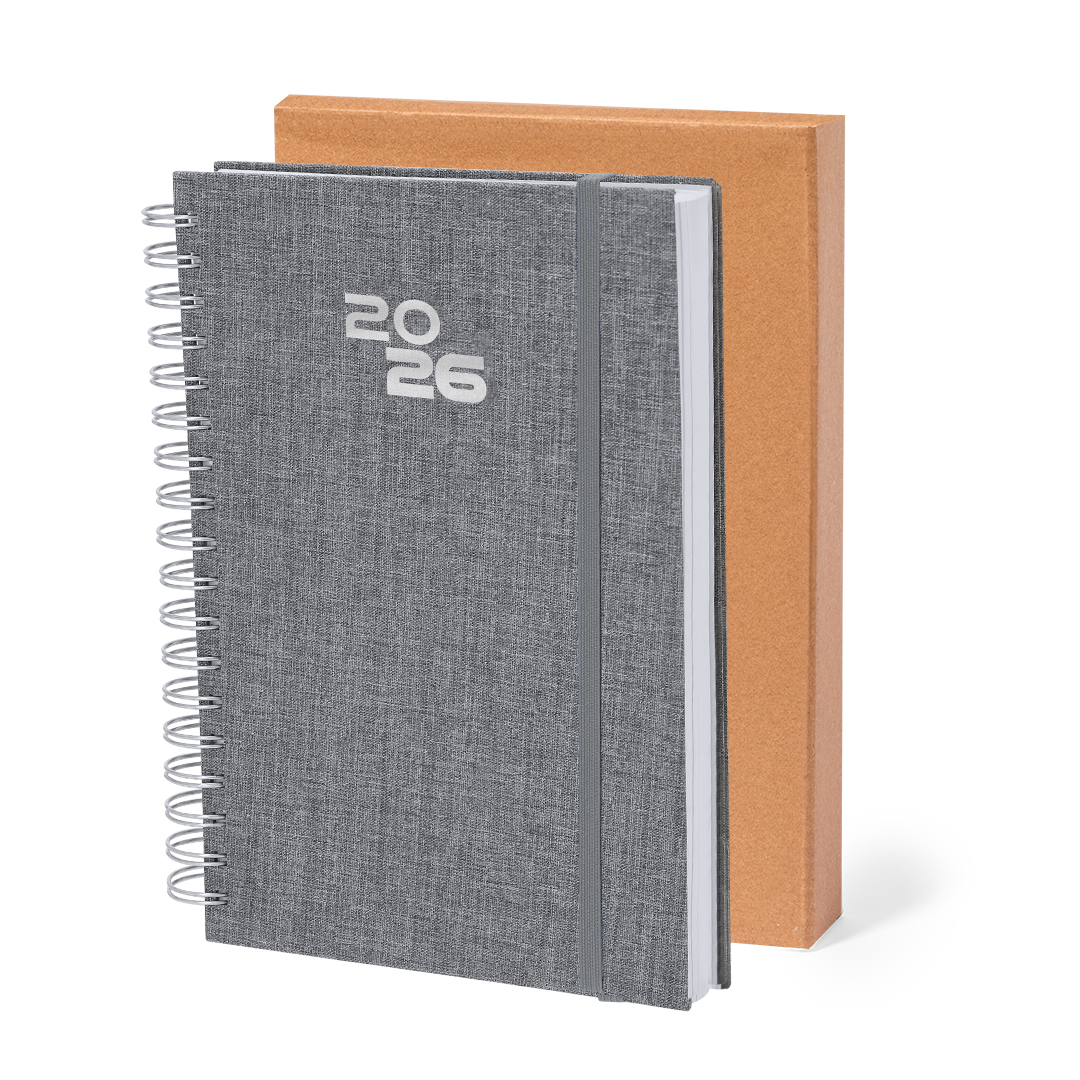 Ringbuch-Tagebuch im B5-Format aus weichem und strapazierfähigem RPET, mit Hartdeckeln und Gummibandverschluss. Inklusive Präsentationsbox aus Kraftpapier und RPET-Logo.Gestaltung der Tagesseite, mit einem Bereich für mikroperforierte Ecken. In 2 Sprachen: Englisch und Spanisch.Das RPET-Material wird aus recyceltem Kunststoff hergestellt, wodurch die Wiederverwendung von Plastikabfällen gefördert und die Nachhaltigkeit des Planeten unterstützt wird.