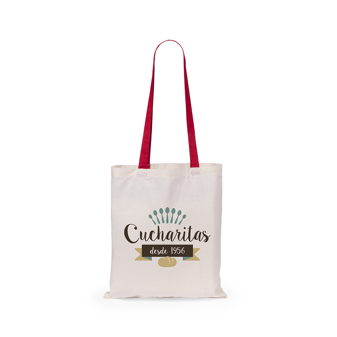 Tasche aus Baumwolle in Naturfarbe. Mit 70 cm langen Henkeln in verschiedenen kräftigen Farben und Steppnähten. Belastbar mit bis zu 7 kg.