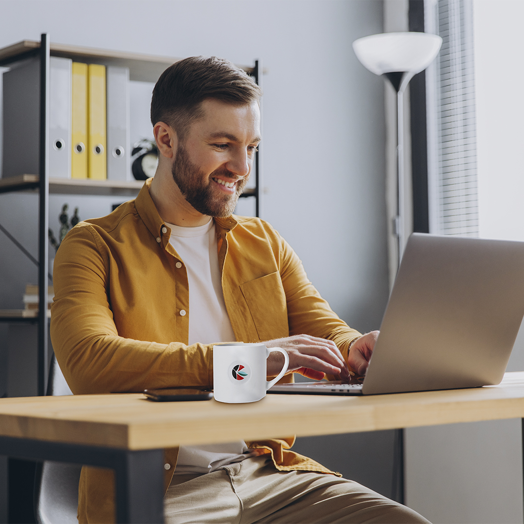 Keramikbecher mit 350 ml Fassung. Außen- und Innenansicht mit mattem Finish. In der Mitte der Tasse befindet sich ein geprägter Kreis, perfekt zum Personalisieren.