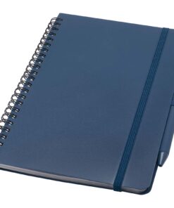 Das Thalaasa A5 Hardcover Notizbuch besteht aus recyceltem ozeangebundenem Kunststoff und umfasst 80 Blatt, liniert, aus cremefarbenem 70 g/m² Papier. Das Notizbuch hat abgerundete Ecken. Es ist mit einem elastischen Verschluss und einer Stiftschlaufe ausgestattet. Der Kugelschreiber mit schwarzer Tinte ist ebenfalls aus recyceltem, ozeangebundenem Kunststoff hergestellt. Schreiblänge: 1000 Meter. Schreibspitze: 1 mm.