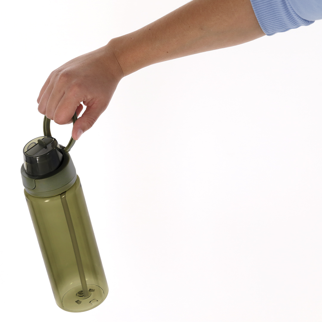 Flasche mit 750 ml Fassung, gefertigt aus widerstandsfähigem RPET und mit einer durchsichtigen Oberfläche. Mit doppeltem Trinksystem, Strohhalm und Trinkloch. Schiebeverschlussdeckel und Klappgriff. BPA-frei.