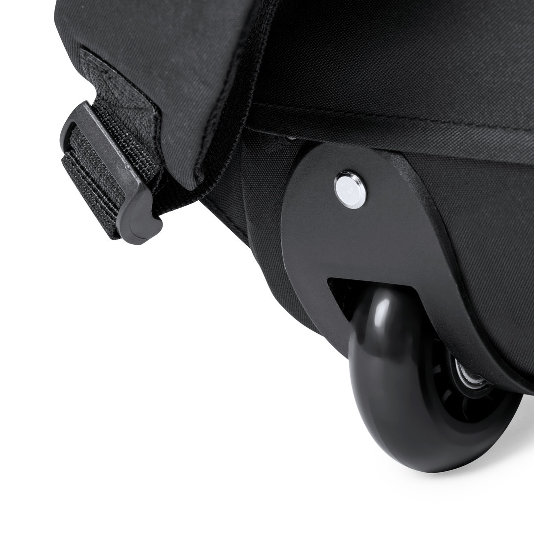 Antonio Miro Trolley-Rucksack, aus strapazierfähigem 300D-Polyester mit schwarzer Oberfläche. Hauptfach und Außentasche mit passendem Reißverschluss, gepolstertem Tragegriff und Seitentaschen Markenlogo auf einer Seite. Gepolstertes Innenfach für Laptops bis zu 15″ und Tablet-Tasche bis zu 11″. Gepolsterte, verstellbare Schultergurte.
