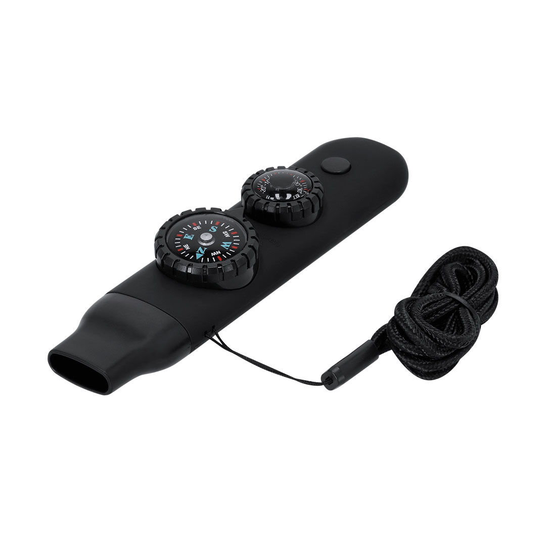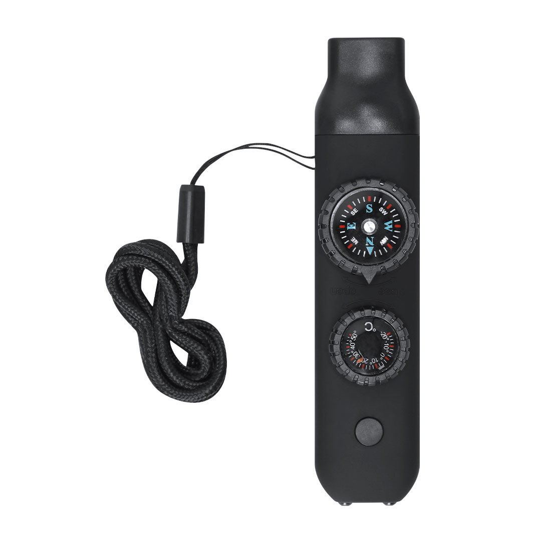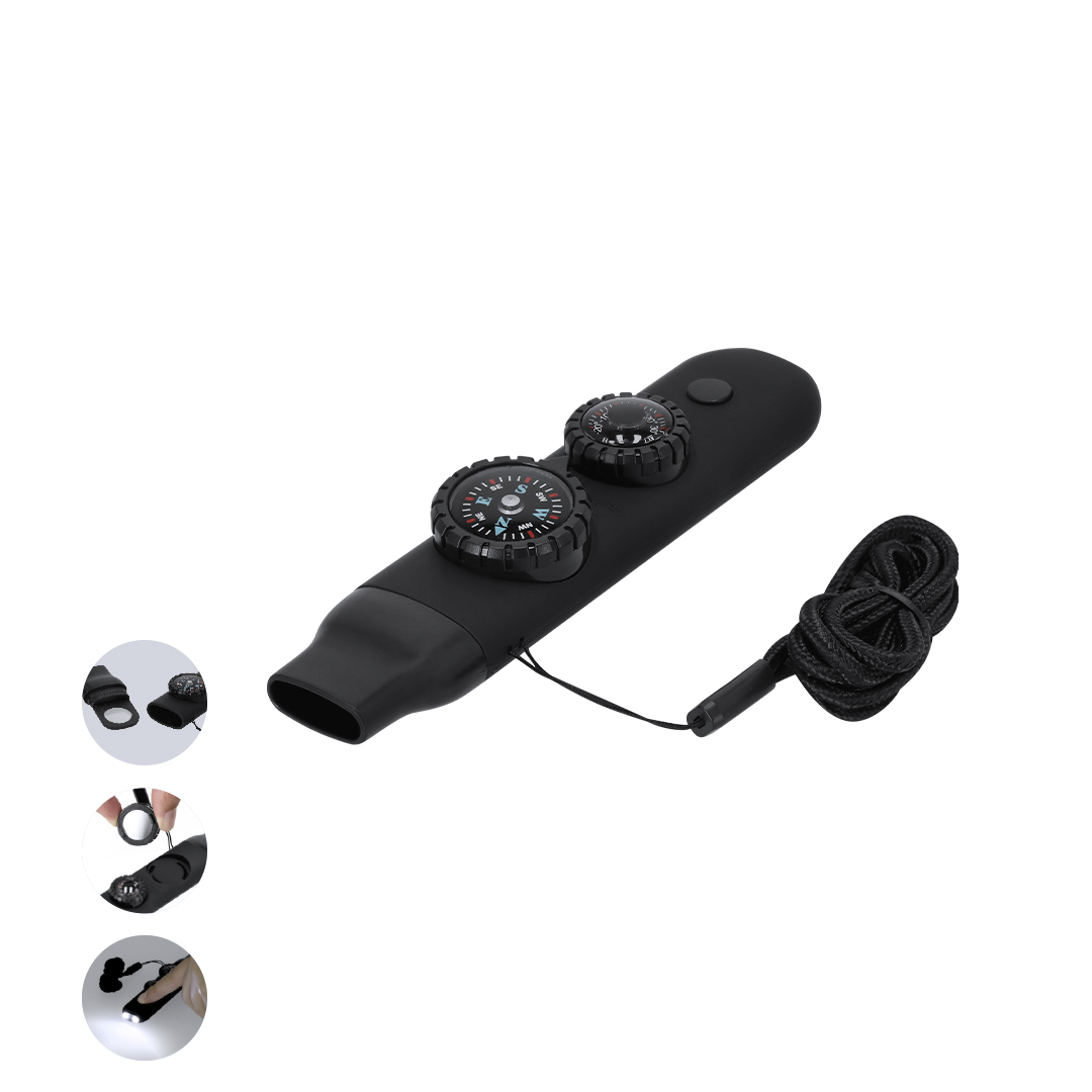 Überlebenspfeife aus widerstandsfähigem ABS mit gummiartiger Oberfläche. Es integriert 6 wesentliche Funktionen: – Kompass mit 2,55 cm Durchmesser mit Hinweisen auf Nord, Süd, Ost und West. – Hochleistungspfeife, ideal zum Aussenden von Notsignalen. – Thermometer mit einem Temperaturbereich von -20 ºC bis 50 ºC – Lupe mit 2 cm Durchmesser, perfekt zur Beobachtung kleiner Details oder sogar zum Entzünden von Feuern durch Konzentration von Sonnenlicht. – Spiegel, Eingebaut unten am Kompass. Taschenlampe mit 2 LEDs und Ein-/Aus-Knopf oben.Enthält ein praktisches Kabel für einfachen Transport, ideal zum bequemen Aufhängen am Hals.