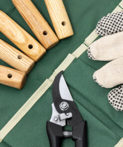 Komplettes Gartenarbeitsset mit 7 Zubehörteilen und verstellbarer Schürze mit Taschen. Inklusive 2 Schaufeln in verschiedenen Größen, zwei Harken, einer Ahle, einer Gartenschere und Handschuhen. Präsentiert in einer Schachtel im Kraftdesign.
