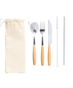 5-teiliges Besteckset aus rostfreiem Stahl, mit Naturholzgriff. Inklusive Löffel, Gabel, Messer, wiederverwendbarem Strohhalm und Reinigungsbürste für den Strohhalm. Präsentiert in einem Beutel aus natürlicher Baumwolle mit Kordelzugverschluss.