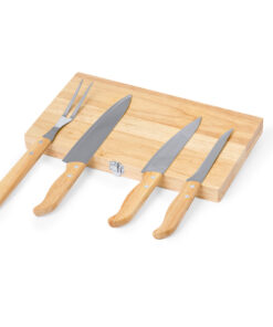 Messerset aus Naturholz und Edelstahl, im gestanzten Holzetui mit Metallschloss. Lieferumfang: Tranchiermesser, Ausbeinmesser, Filetiermesser und Kochmesser. Präsentiert in einer Kraft-Design-Box.